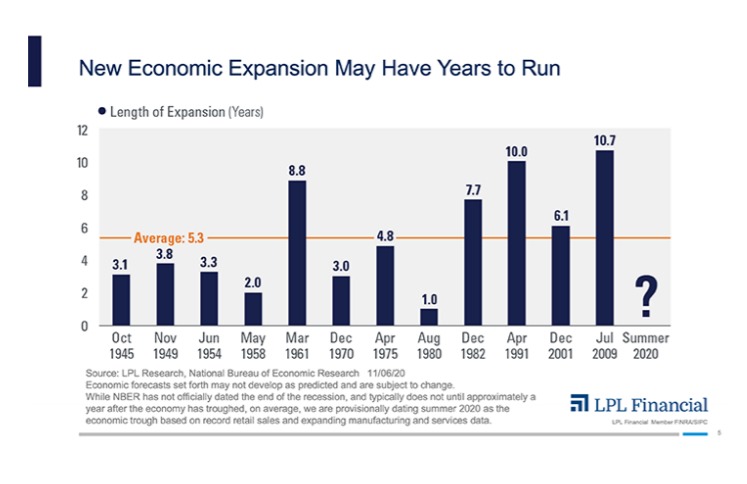When the economy began to shift into gear in the second half of 2020, we believe a new economic expansion likely began. Dating back to WWII, economic expansions have lasted more than five years on average, with the past four expansions averaging more than eight years [FIGURE 1].