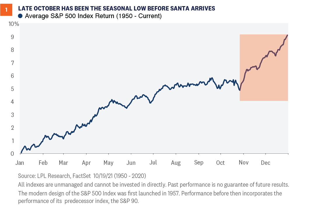 The S&P 500 Index has gained more than 20% so far this year, making more than 50 record highs along the way. Certainly nobody should be upset with that return if that was all 2021 brought us. However, we see signs that there could be more gains to come in the final two months of the year. Seasonal tailwinds, improving market internals, and clear signs of a peak in the Delta variant all provide potential fuel for equities heading into year-end, and we maintain our overweight equities recommendation as a result.