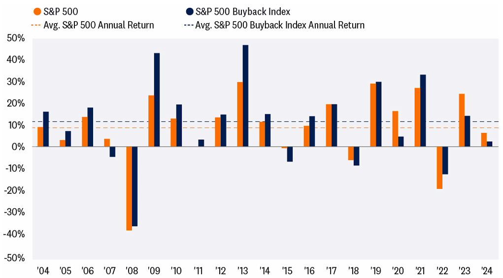 After a brief lull in 2023, buyback activity appears to be back this year. A resilient U.S. economy, easing inflation pressures, and expectations for an eventual shift to interest rate cuts have given corporate America confidence to boost authorized share repurchases. These companies have a history of outperforming the broader market and tend to have more exposure to momentum, value, and growth factors. While buybacks also reduce share count and help support earnings growth and valuations, they can also help limit downside volatility during periods of selling pressure.
