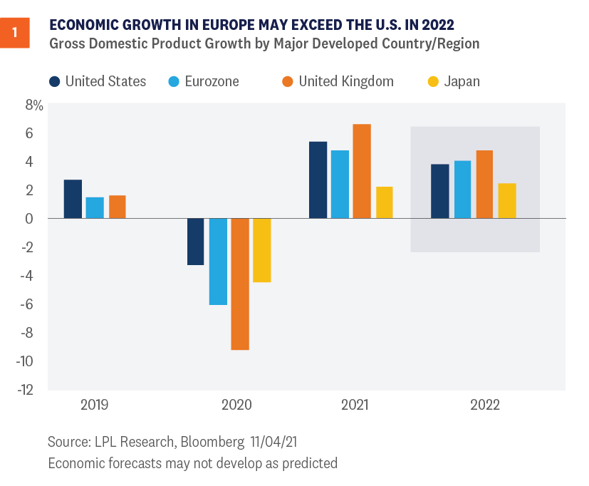 As shown in Figure 1, the consensus forecasts for gross domestic product (GDP) growth in 2022 are calling for the European economies (the Eurozone and the United Kingdom) to grow faster than the United States next year. Europe and Japan are both ahead of the United States right now in vaccinations administered as a percentage of their populations (source: Ourworldindata.org), after playing some catch-up, which positions those economies to take the next step forward in their recoveries. Europe and Japan are also earlier in their economic cycles, leaving more upside in terms of growth potential.