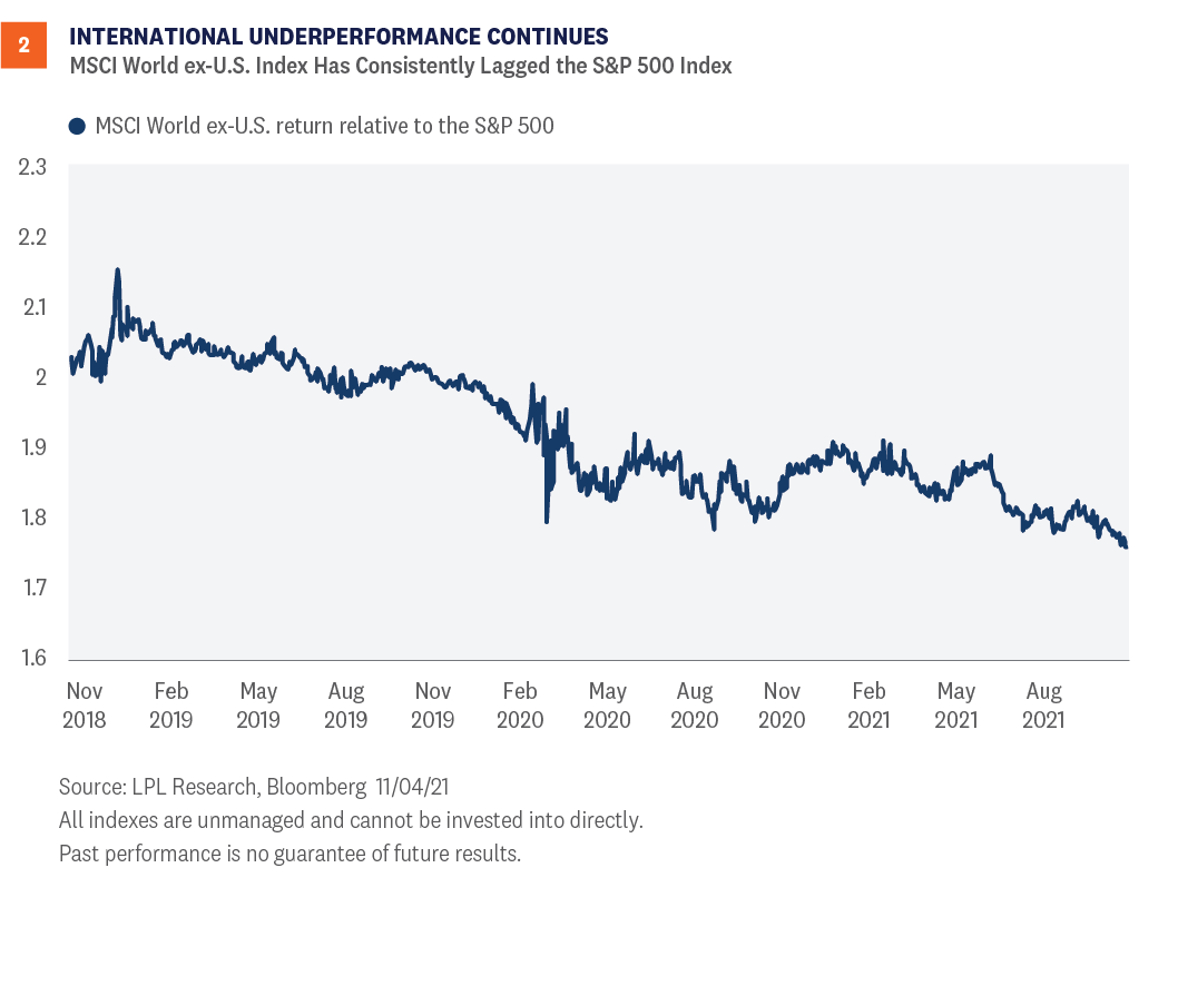The technicals for international equities also support an overall cautious stance. As shown in Figure 2, the MSCI World Ex-U.S. Index, an index that incorporates both foreign developed and emerging markets, has continued to substantially lag the S&P 500, continuing the relative downtrend that had been in place prior to the pandemic.