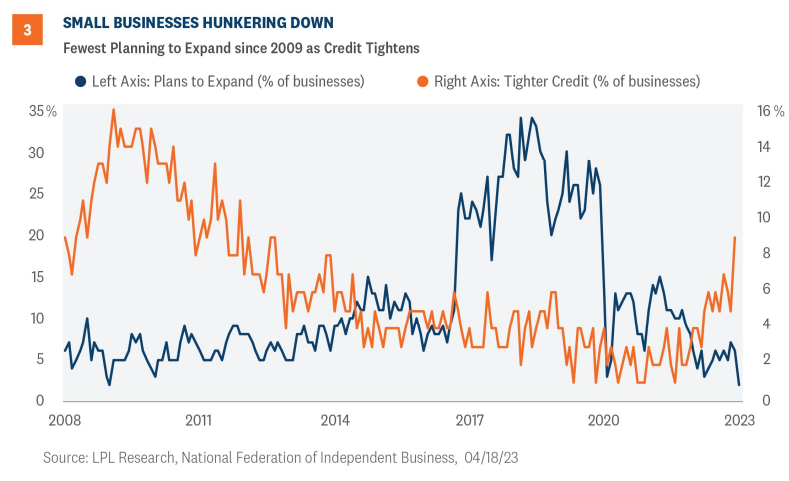 We know small businesses are especially concerned about a potential credit crunch. As shown in Figure 3, firms are hunkering down as few have expansionary plans in the near future. In fact, the number of firms reporting any expansion plans is the lowest since early 2009 when the economy was in the depths of the Great Financial Crisis. No doubt, tighter credit conditions impacted those decisions. The percent of small businesses reporting tighter credit is the highest since 2012, as lending institutions tighten up under the uncertainty of the macro  landscape and following mid-March banking turmoil.