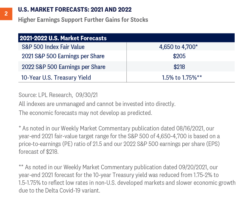 It’s not too early to start thinking about 2022 as the fourth quarter gets underway. Prospects for above-average economic growth and further earnings gains next year point to another good year for stock investors. We expect interest rates to stay low enough to justify maintaining current valuations, which could set the stage for double-digit returns for the S&P 500 next year. Look for more on the earnings outlook in an upcoming commentary previewing third-quarter earnings. And once earnings season gets rolling, we’ll get rolling on writing Outlook 2022.