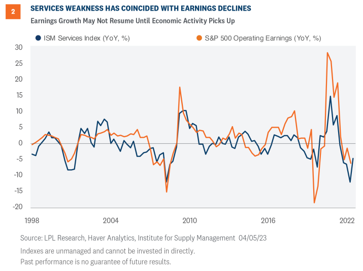 The components of the ISM surveys provided further evidence of a slowing economy, including a 10-point drop month over month in services new orders. As the economy slows and inflation decelerates, the Federal Reserve (Fed) will be in a better position to pause the current rate hiking campaign, although that will likely be accompanied by weak earnings in the first half of this year, and potentially beyond.