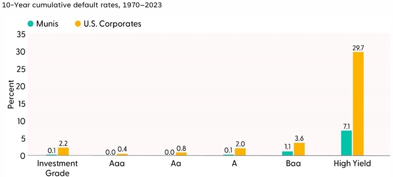 Muni bonds, in general, have better default characteristics than corporate bonds. Since 1970, the 10-year cumulative default rate for investment grade munis is barely above zero, whereas it was over 2% for similarly rated corporate bonds. Moreover, when compared to the riskier segments within the corporate credit universe, lower rated/high-yield munis enjoyed a default rate more than 75% less than corporate alternatives.
