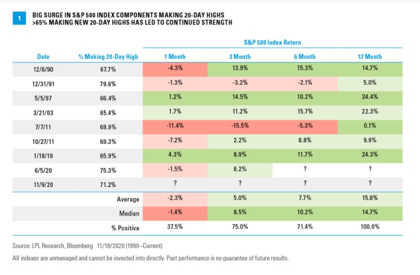 Finally, participation has not been limited simply to large cap stocks. After lagging the S&P 500 by more than 16% in the first quarter of 2020, last week the small cap Russell 2000 Index made its first record high in more than two years and is now outperforming the S&P 500 by 11% thus far in the fourth quarter.