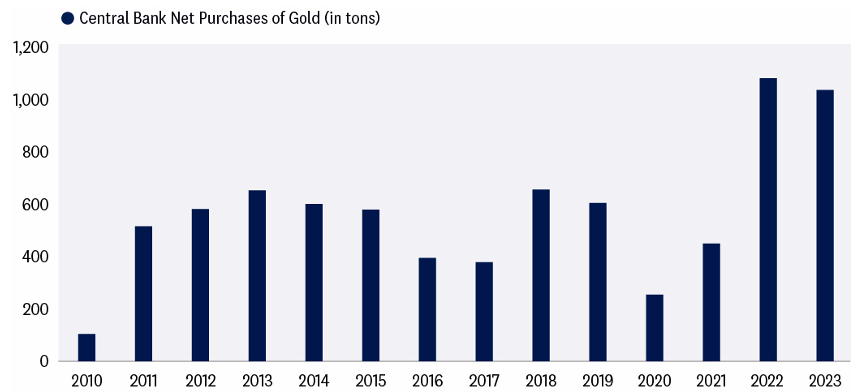 While a weaker dollar and falling interest rates are a big part of the gold-rally narrative, global central banks are another part of the story. Over the last few years, gold demand among central banks has notably accelerated, including record-setting net purchases of gold in 2022 and near record-level buying in 2023. The jump in demand is attributable to foreign central banks diversifying away from dollar reserves, partially due to concerns over ballooning U.S. deficits, but likely more due to concerns over reserve assets being seized by the U.S. government, as was the case for Russia following their invasion of Ukraine in 2022. Confidence in the latter is supported by China’s central bank adding to their gold reserves for 16 straight months after being inactive in the market since 2019.
