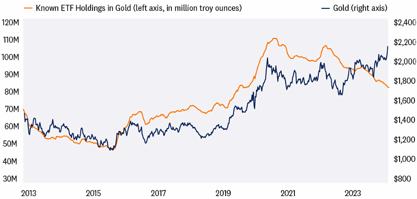 In addition to a bullish technical setup, a constructive macro backdrop, and robust central bank buying, gold could see a rebound in demand from ETFs. Historically, the price of gold and physical gold holdings in ETFs are positively correlated, but more recently, gold prices and gold ETF holdings have notably deviated — providing more evidence of the impact central bank demand has had on gold. However, with gold breaking out to new highs and creating lots of headlines along the way, inflows into gold-related ETFs could be due for a rebound as the fear of missing out trade kicks in. History supports this thesis, as peaks in gold ETF holdings occurred after gold prices peaked in 2020, 2021, and mid-2023.