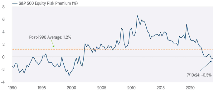 Comparing yields from fixed income to earnings from stocks, investors are being minimally compensated for taking on equity risk relative to Treasury yields. And for those thinking lower Treasury yields may prop up valuation, we expect only minimal downside to long-term Treasury yields from current levels.