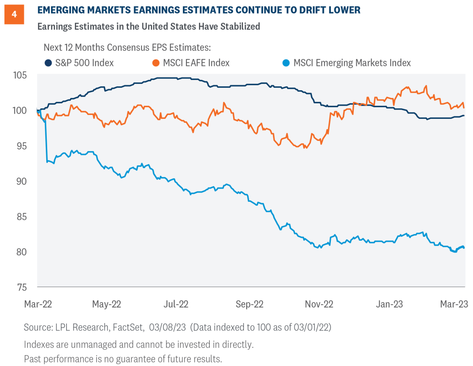 The earnings growth picture suggests a similar outlook for developed international and U.S. equities, as shown in Figure 3. These are just estimates, but consensus currently reflects 1.8% growth in earnings for the S&P 500 and MSCI EAFE indexes. The outlier is emerging markets (EM)—the MSCI EM Index is expected to see a 3.4% decline in earnings in 2023.