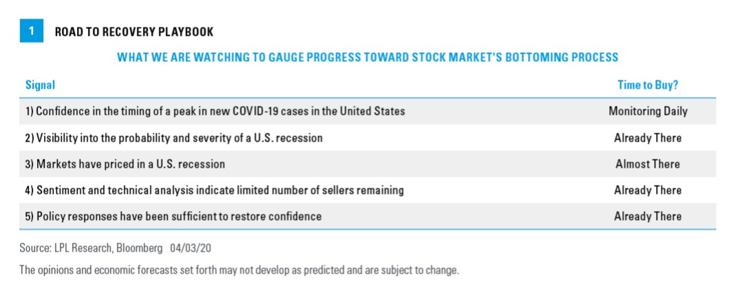 For more tactical investors, we continue to suggest patience as the crisis develops. A more attractive entry point may present itself soon. We will continue to follow our Road to Recovery Playbook to gauge progress on the market’s bottoming process.