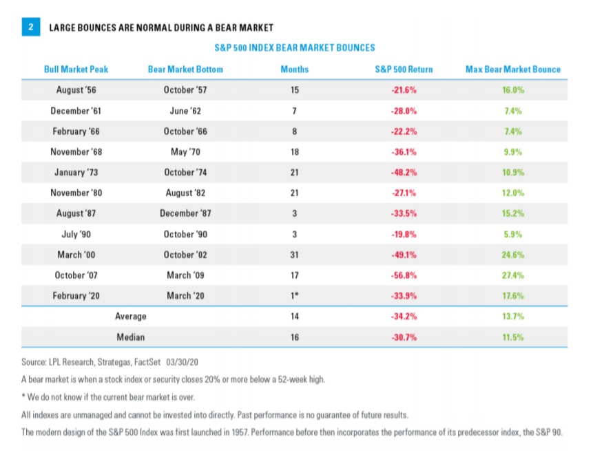 We looked at the nine bear markets that have taken place since 1950, and we found the S&P 500 had an average maximum bounce of about 14% along the way [Figure 2]. Incredibly, during the tech-bubble bear market of the early 2000s, we found six separate 10% bounces along the way, before the ultimate low of 49.1% below the previous high. We hope this helps put into context the S&P 500’s 17% three-day rally March 24–26. The sharpest rallies historically have taken place during bear markets, and although that recent bounce was a welcome reprieve, investors should keep in mind it may have been a bear market rally, and recent gains may not hold.