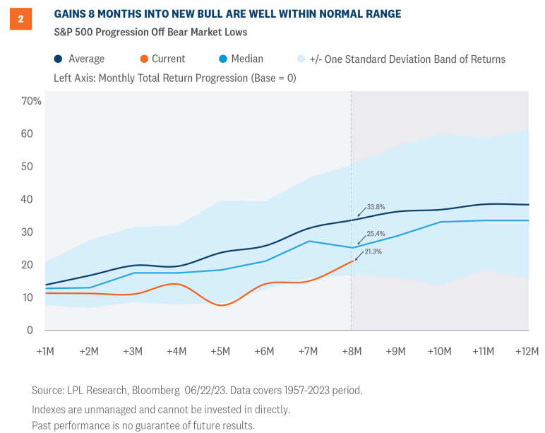 We know it’s old news at this point, but on June 8, 2023, the S&P 500 entered a new bull market. After such a strong rally off the October lows, this young bull probably needs a breather. A look at the charts suggests this market may be due for a pause. Bull markets are not linear. However, the impending end of the Federal Reserve (Fed) rate-hiking campaign, and the economy’s and corporate America’s resilience, help make the bull case that steers LPL Research toward a neutral, rather than negative, equities view from a tactical asset allocation perspective.