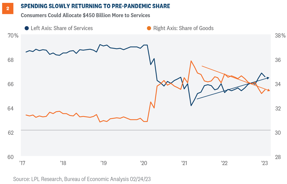The conundrum is investors are regularly receiving a mix of both good and bad news. One example is the slow recalibration of goods and services spending. During those early years of the pandemic, consumers reallocated more on goods and less on services. The return to “normal” has been slow as the share of services spending is still roughly 2.5 percentage points below pre-pandemic share as of the latest report (Figure 2).