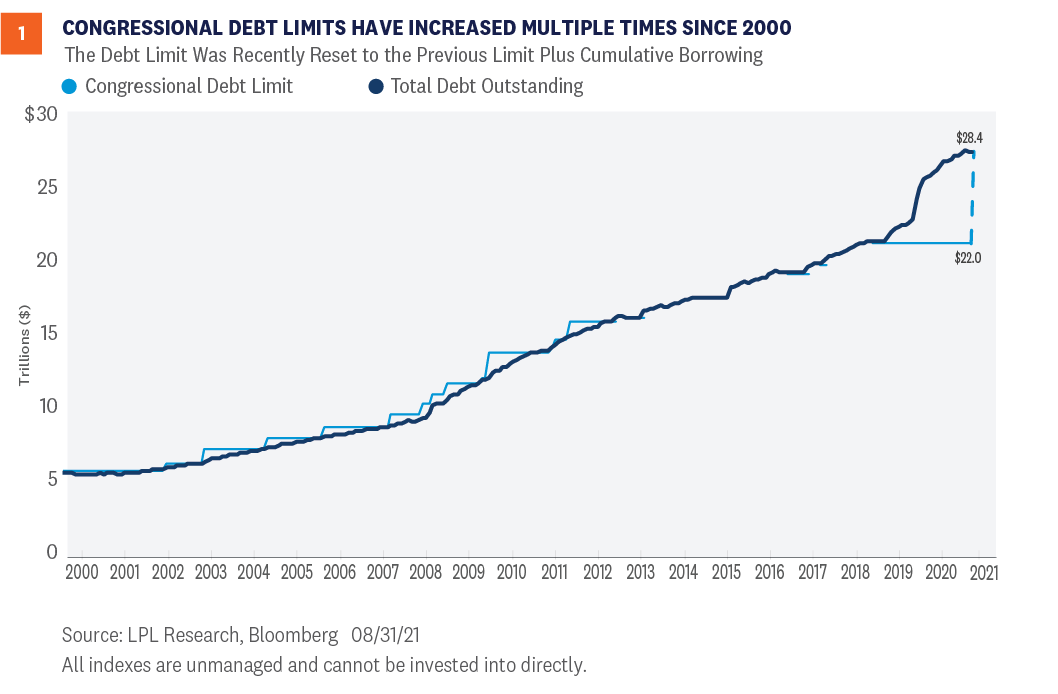 Through a bipartisan budget act in 2019, Congress suspended the debt ceiling through July 31, 2021, which allowed the government unfettered access to capital markets. As seen on the chart, when the suspension was enacted, total debt outstanding was $22 trillion—but current debt levels have risen to $28.4 trillion, which is the new debt ceiling level [Figure 1]. The debt ceiling will need to be raised soon or the U.S. Treasury will likely run out of its “extraordinary measures” to fund government activities. Treasury Secretary Janet Yellen recently said this would likely occur in October.