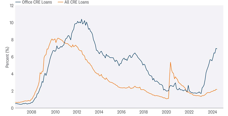 And while there is a lot to like about preferred securities, there will likely be financial institutions that could be negatively impacted by the ongoing challenges in the commercial real estate (CRE) market. The surge in interest rates and pullback in bank lending following last year’s regional banking crisis has led to substantial stress in the U.S. CRE market, particularly within the office sector.