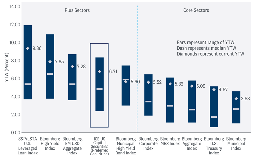 Despite these concerns, preferred securities, as proxied by the ICE BofA All Capital Securities Index, have outperformed many other plus (and core) sectors so far this year. While we still recommend the majority of fixed income exposure to be allocated to core bonds, for those income-oriented investors willing to take on some additional credit risk, preferred securities may be an attractive investment to consider.