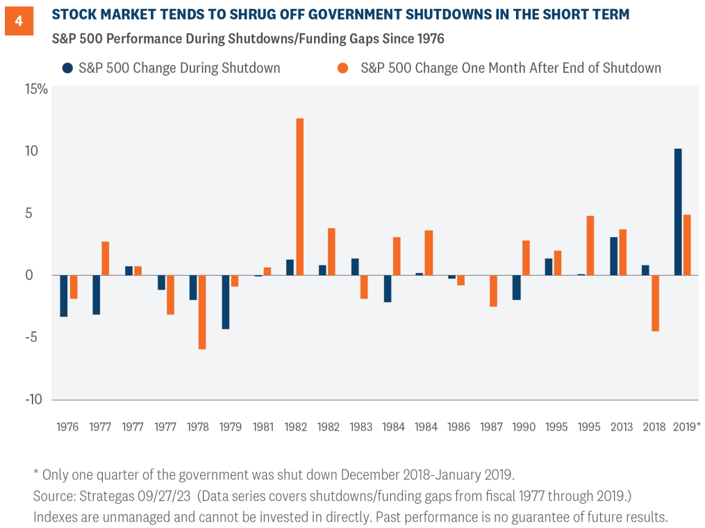 With that possibility in mind, as negotiations ramp back up again over the next several weeks, the key question for investors will be what impact a shutdown could have on the markets and economy. Well, the history of stock market performance during and shortly after shutdowns is encouraging, as shown Figure 4. On average, stocks have been flat during the past 20 shutdowns, but have been higher during the last five, as markets view these events as temporary with very little economic impact. Also consider that stocks have been higher by an average of 1.1% during the one month after previous shutdowns ended, with gains in 60% of those periods.