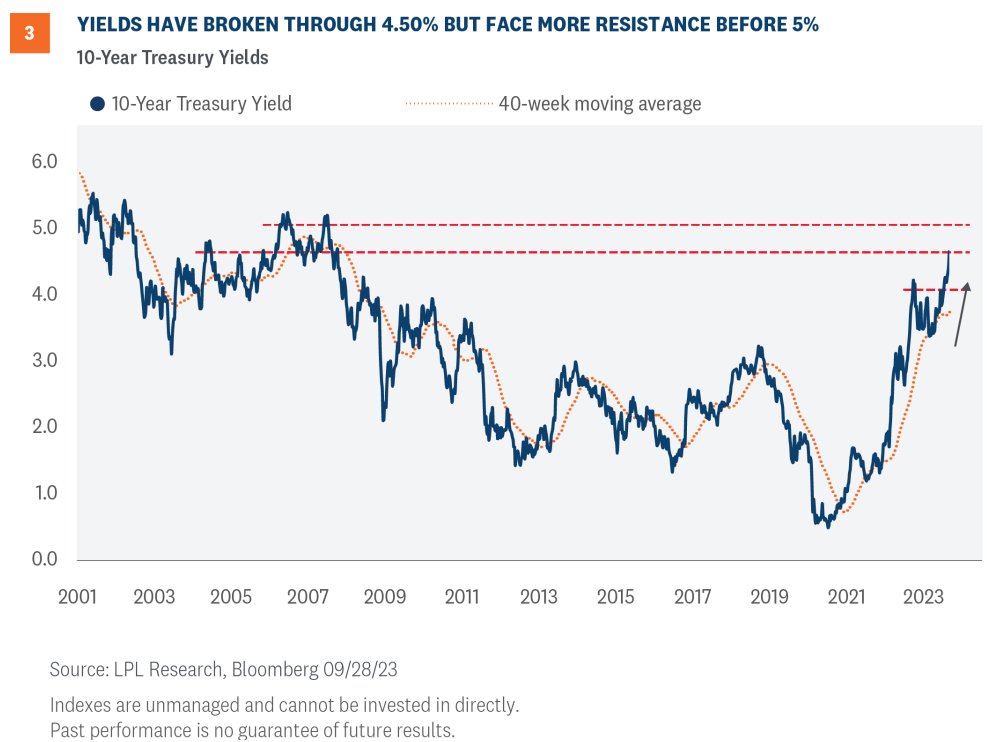 The fundamental call for the 10-year Treasury yield to perhaps remain in the 4s through yearend matches up well with the technical analysis picture. As shown in Figure 3, 10-year yields have broken out above the October 2022 highs at 4.34%, leaving 4.70% and 4.90% as the next areas of overhead resistance. Momentum is confirming the breakout, but yields are now historically overbought. The Relative Strength Index (RSI)—a momentum oscillator used to measure the speed and magnitude of price action—climbed to 73 last week, marking its highest reading in nearly a year.