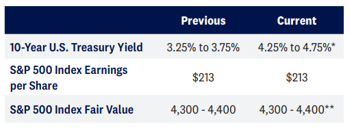 **Our year-end 2023 fair-value target range for the S&P 500 of 4,300-4,400 is based on a price- to-earnings ratio (PE) near 19 and our S&P 500 earnings per share (EPS) forecast of $230 in 2024.