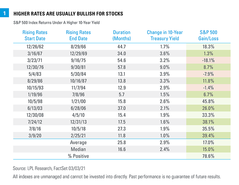 The 10-year Treasury yield continues to climb higher, but remains low by historical standards. Still, the size of the move since July 2020—and the more recent acceleration—has some market participants worried about the potential impact on stock markets if rates continue to rise. Historically, the S&P 500 Index has endured extended periods of rising rates well. If an improving growth outlook is part of what’s driving rates higher, it should also support corporate profits, creating a positive fundamental backdrop for stocks.