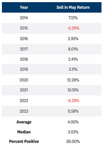 The “Sell in May” return column is based on S&P 500 price returns from the May through October timeframe.