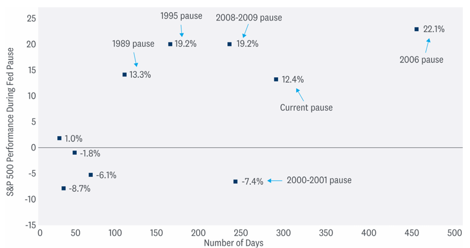 LONG FED PAUSES TEND TO OVERLAP WITH ATTRACTIVE STOCK MARKET GAINS