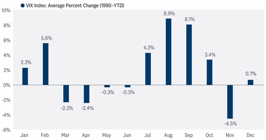If you plan to stay invested through the “Sell in May” period — LPL Research recommends holding a neutral equity market position — volatility could be the price of admission. The CBOE Volatility Index, more commonly referred to as the VIX or “fear gauge,” historically advances from July through October, often peaking in late September or early October.