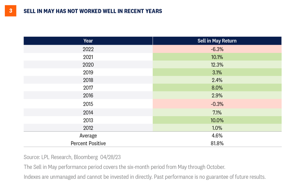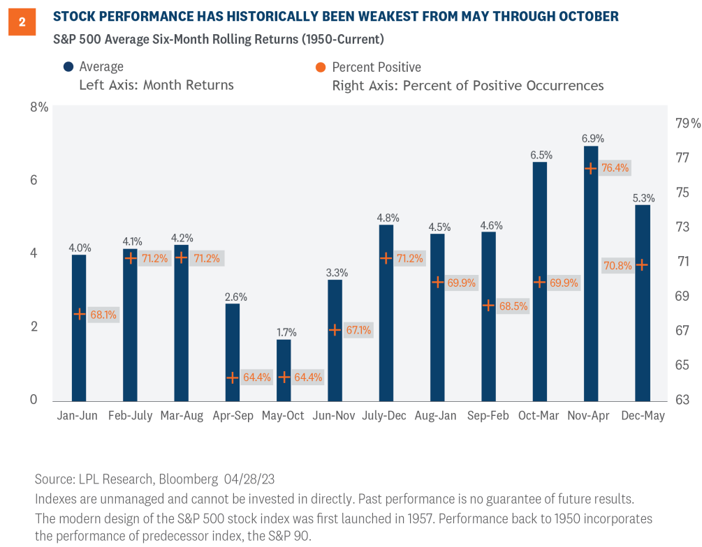 “Sell in May and go away” is the seasonal stock market pattern in which stocks generally produce the best returns from November through April and the worst returns from May through October. This pattern has been strong enough—and the adage popular enough—that it has probably been somewhat of a self-fulfilling prophecy over many years. Some investors do think it’s best to either avoid or reduce equities during this period. We’re not so sure.