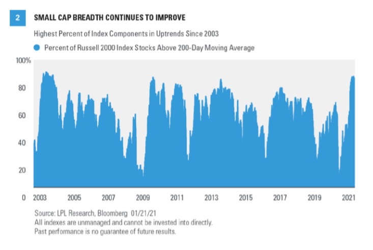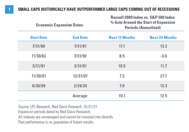 Expectations of this sharp earnings rebound have helped drive strong small cap performance since the bull market began in March 2020. Small cap stocks are broadly more economically sensitive than large cap stocks, which is helpful when economic growth expectations improve. This helps explain why optimism surrounding the reopening of the economy and prospects for more fiscal stimulus under the new administration have given small caps such a big boost lately.