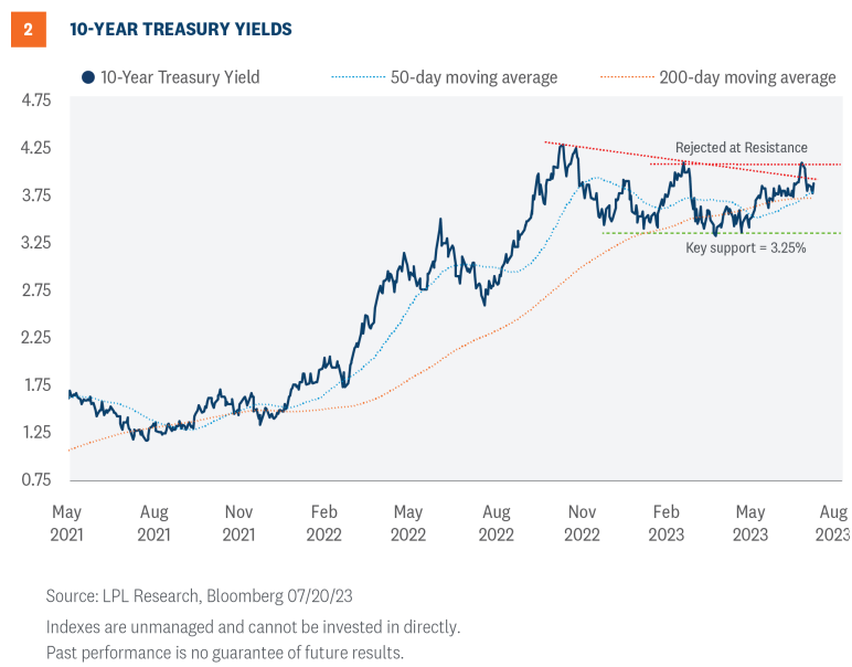Treasury yields have been relatively volatile over the last several weeks as speculation intensifies over the Fed’s next monetary policy moves. Signs of labor market strength in the June ADP report drove rate hike expectations higher and two-year Treasury yields back to their March highs at 5.08% earlier this month. However, yields failed at this key resistance level after the nonfarm payrolls report showed that hiring decelerated in June. Technically, the message from the failed breakout and subsequent pullback in two-year yields suggests the Fed could be done raising rates after this week’s assumed 0.25% rate hike. Of course, the message from the market is subject to change, and if the Fed does lean more hawkish than expected, watch for resistance at 5.08%, as a breakout above this level would point to more rate hikes on the horizon.