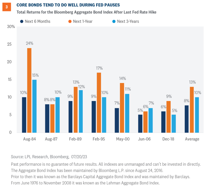 If history at least rhymes during this cycle and we do see lower yields over the next year, intermediate core bonds could very well outperform cash and other shorter maturity fixed income strategies. Historically, core bonds, as proxied by the Bloomberg Aggregate Bond Index, have performed well during Fed rate hike pauses (Figure 3). Since 1984, core bonds were able to generate average 6-month and 1-year returns of 8% and 13% (annualized), respectively, after the Fed stopped raising rates. Moreover, all periods generated positive returns over the 6-month, 1-year, and 3 year horizons.