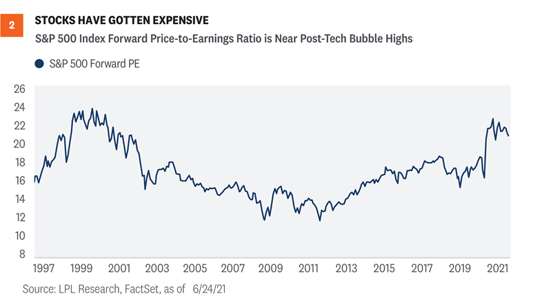 But here’s the other side of the story. Many investors assessing valuations look at the price-to-earnings ratio (PE) and stop there. As shown in [Figure 2], the S&P 500’s PE is now about 21, compared with the long-term average near 17. By that measure, stocks do look overvalued, but we don’t think that metric provides a complete picture. Interest rates should be considered, as they tell us how much companies’ future profits are worth in today’s dollars, and they allow us to compare high stock valuations to even higher bond valuations.
