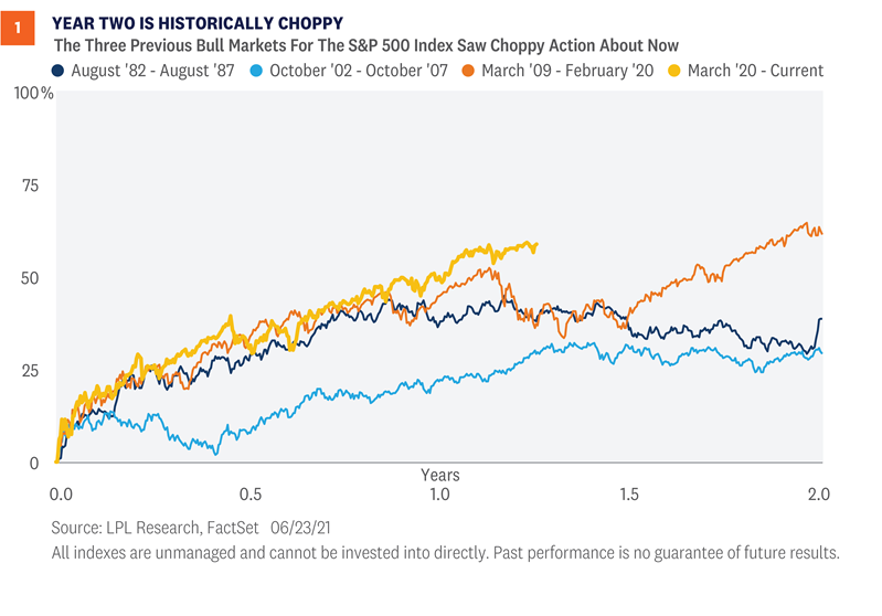 The good news is the second year of every single bull market since World War II has seen the S&P 500 climb higher. That is 12 for 12 for year two gains. The second year for this bull market started on March 23, 2021, and so far, stocks are off to a solid start—up more than 9%. The bad news is for many of the past bull markets, year-two gains were quite muted, as stocks caught their breath from the year-one sprint. With the S&P 500 up more than 90% from the March 23, 2020 lows, we wouldn’t be surprised at all if history repeated and stocks saw choppier action in year two.