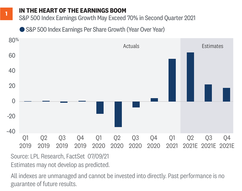 • Is this as good as it gets? We like good news. Who doesn’t? But at some point, the good news is fully expected and factored into stock prices. That means markets may not respond as well to the next piece of good news. For the past few quarters, companies have delivered not just good, but great news. Now investors are rightly asking if the positive surprises may be coming to an end, as companies may no longer be holding anything back. If the outlooks from management teams are conservative again because of ongoing COVID-19 or other uncertainties, additional upside surprises could be in store for the second half and potentially drive the next leg of this rally.