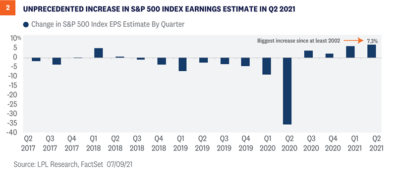 Also consider that the consensus S&P 500 earnings estimate for the second quarter increased more than 7% during the quarter—the most ever recorded since FactSet began tracking that statistic in 2002 [Figure 2]. Putting this into perspective, over the past 15 years this statistic has averaged a 5% decline. Pushing those estimates higher were 66 S&P 500 companies that raised guidance for the second quarter, the most since FactSet began tracking that metric in 2006. Earnings estimates for the energy, financials, and materials sectors saw the biggest positive revisions.